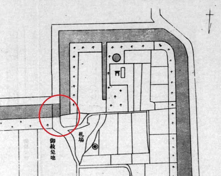 入り口に入ると通路は西に屈曲して枡形を形成し、図に御赦免地とある庄屋屋敷から横矢を掛けられる道筋になっていることが分かります。