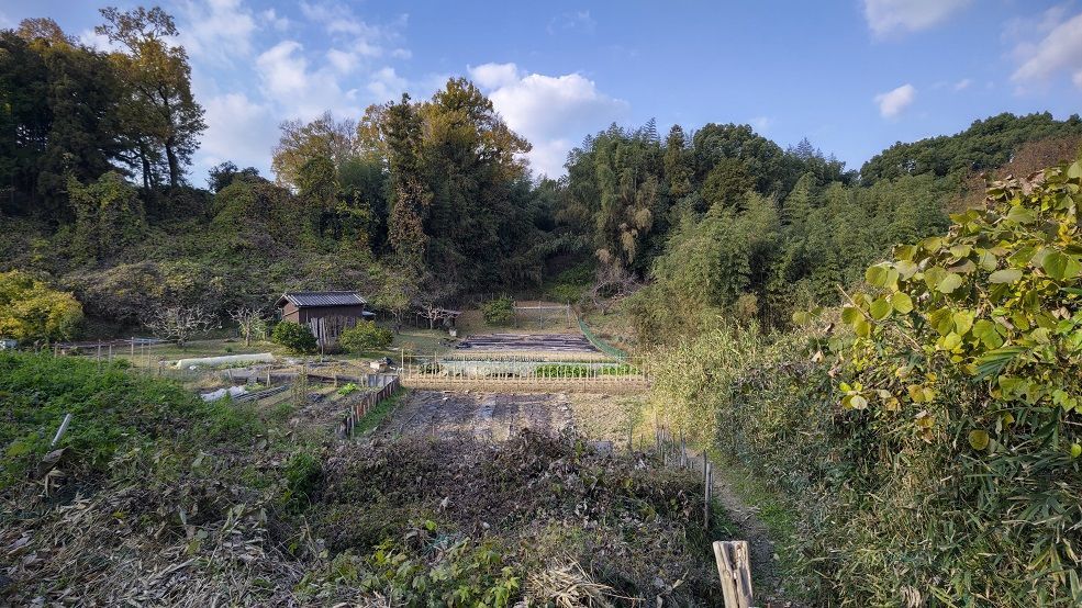 写真右側の畑が南郭で、その東側外縁部を沿うように参道が続きます。