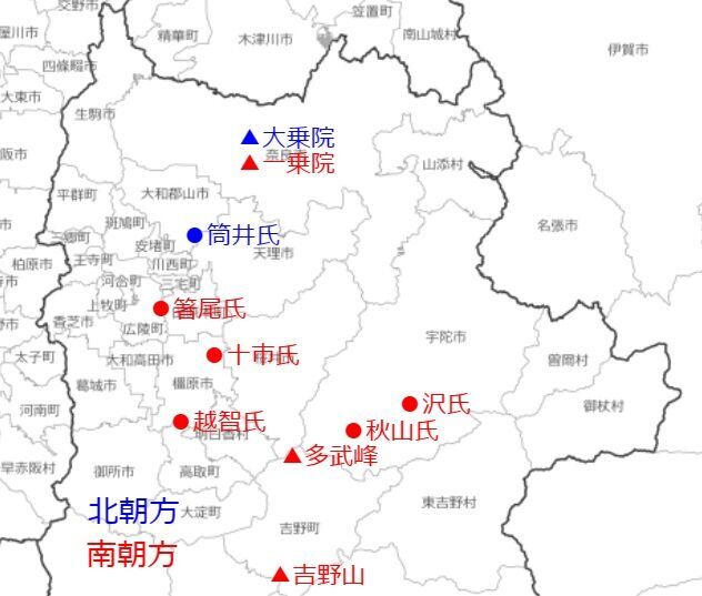 筒井氏は一乗院衆徒でありながら北朝方についており、一方、大乗院方国民であった十市氏は南朝方に付くなど、自らが所属する門跡寺院の意向ではなく、領地の地理的関係からどちらに味方をするか決めた状況が伺えます。